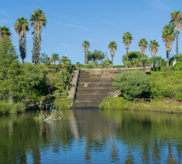 Las características de este parque rabideño, lo configuran como un espacio ajardinado, adaptado a una irregular topografía del terreno que favorece y justifica los cursos de agua que lo recorren. El acogedor y sugerente rumor del agua, en movimiento o remansada, acompaña al visitante desde la misma entrada al recinto, siendo una fuente en forma de géiser quien da la bienvenida. En el lago conviven plantas acuáticas de nuestro entorno junto con otras de origen diverso. Los papiros, los nenúfares y los cipreses de los pantanos han encontrado su hábitat y comparten agua con los juncos o las eneas.